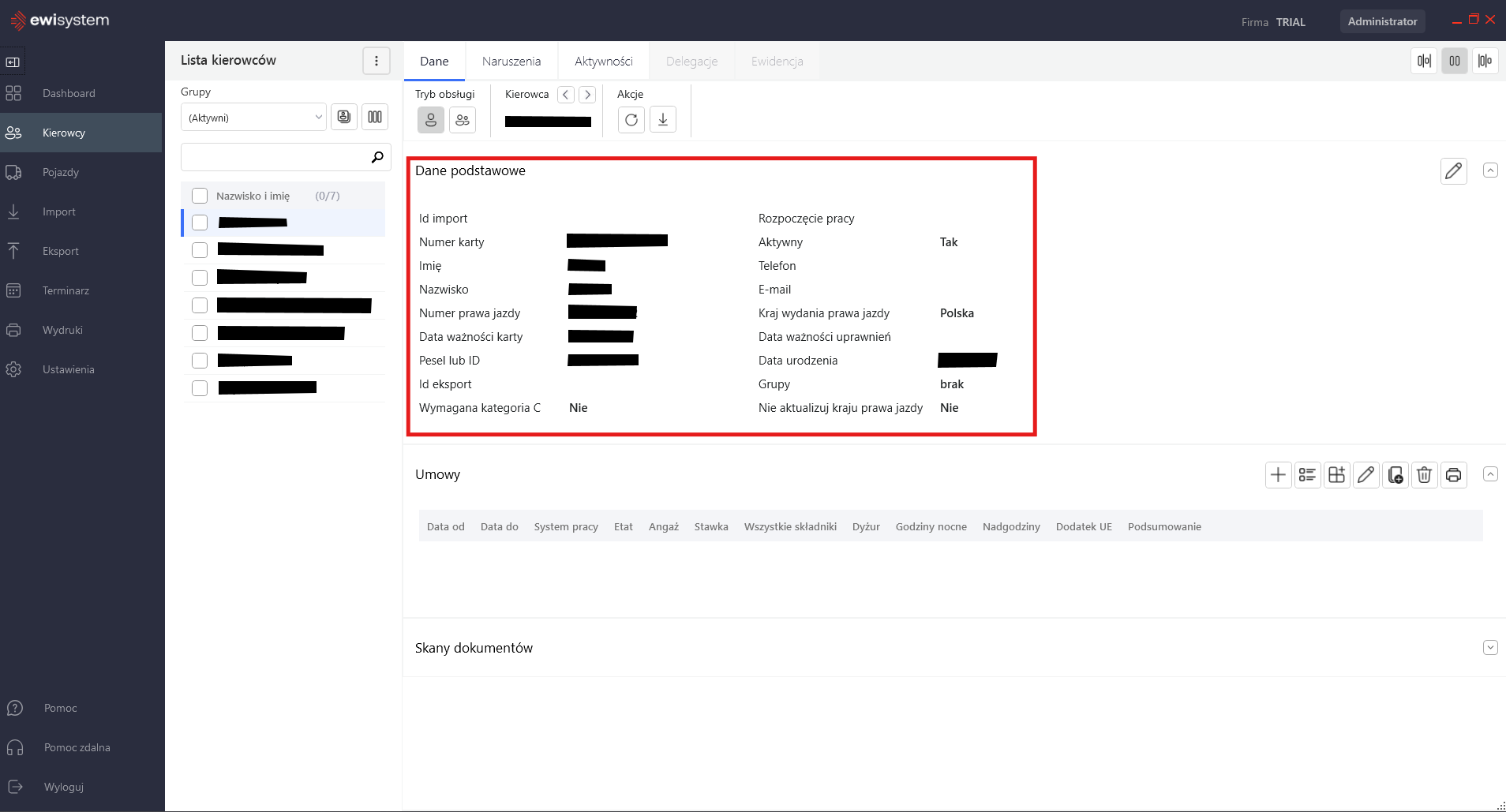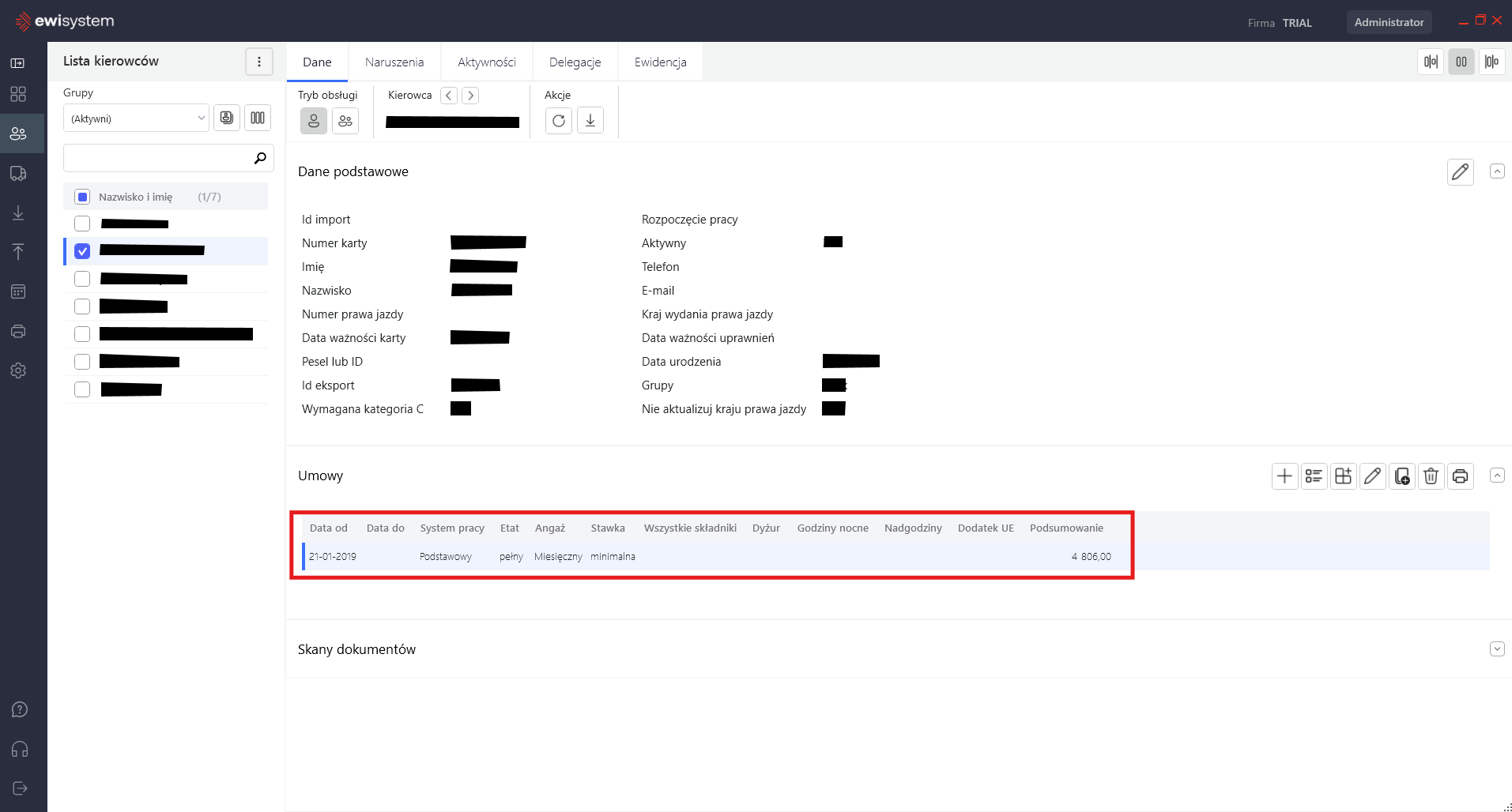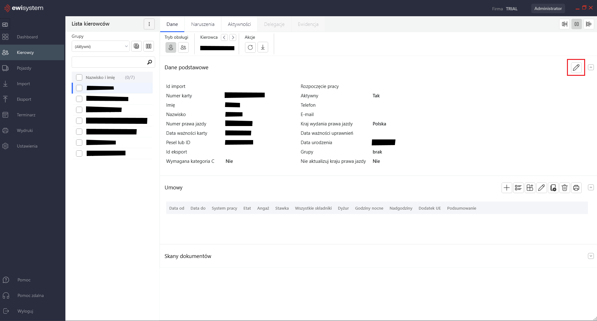 W tym miejscu znajdziesz podstawowe dane kierowcy, które możesz edytować lub uzupełniać oraz przygotujesz umowy i aneksy, które później wydrukujesz.