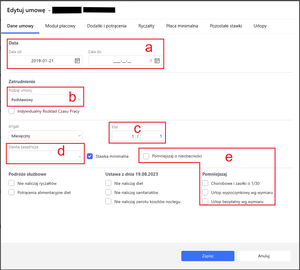 W pierwszym widoku znajdziesz datę rozpoczęcia i zakończenia umowy(a), rodzaj zatrudnienia i system pracy(b), wymiar etatu(c), stawkę zasadniczą(d) i sposób jej pomniejszania(e).