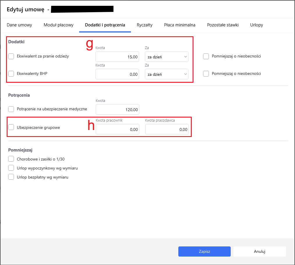 Następny widok to dodatki i potrącenia. Tutaj wprowadzisz wartości ekwiwalentu za pranie odzieży/używanie odzieży czy ekwiwalenty BHP(g) oraz wartości pozapłacowych świadczeń pracowników, z podziałem na część pracownika i pracodawcy(h).