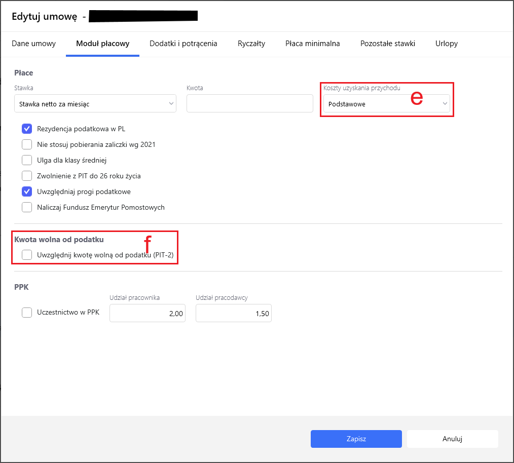 W kolejnym widoku “moduł płacowy”, możesz zmienić wartości dla kosztów uzyskania przychodu(e) lub zaznaczyć stosowanie ulgi podatkowej(f). Te informacje wpływają na sposób wyliczania netto w programie dlatego warto je odpowiednio zaznaczyć.