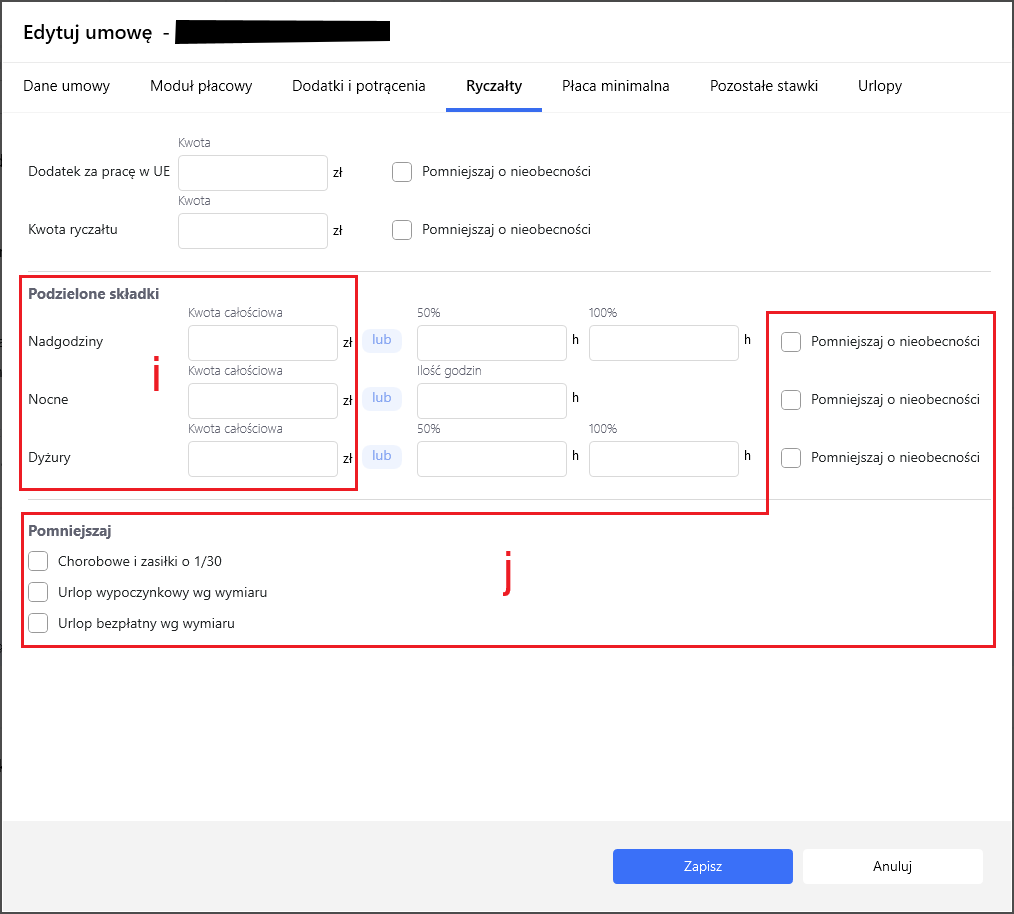 W czwartym oknie “ryczałtów”, znajdziesz miejsce na wpisanie wartości zryczałtowanych składników, takich jak nadgodziny, dodatki nocne czy wynagrodzenie za dyżur. Jeśli wcześniej pomniejszasz wynagrodzenie zasadnicze o nieobecności, przenieś te same zasady na ryczałty(j), dzięki temu zachowasz jedną, spójną zasadę pomniejszania składników w firmie. Dzięki temu zyskasz poczucie spokoju w tłumaczeniu dokumentów podczas kontroli.