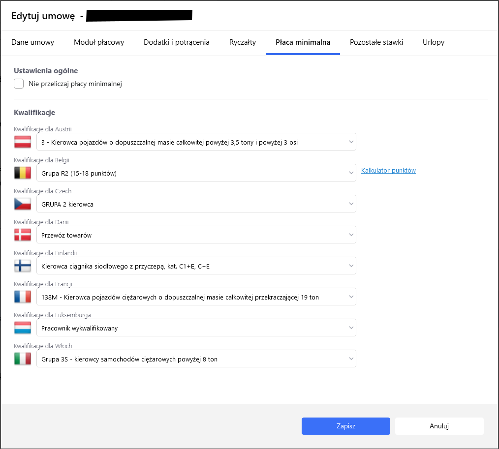 W oknie płacy minimalnej możesz wyłączyć dla wybranego pracownika przeliczanie płac minimalnych lub wybrać inną niż domyślną, kategorię kwalifikacji pracownika w wybranym Państwie. Opcje domyślne są standardowo przypisane do kierowców tzw. ciężarówek. Jeśli jednak Twoi kierowcy wychodzą poza schemat ustawień, możesz zmienić im grupy indywidualnie.