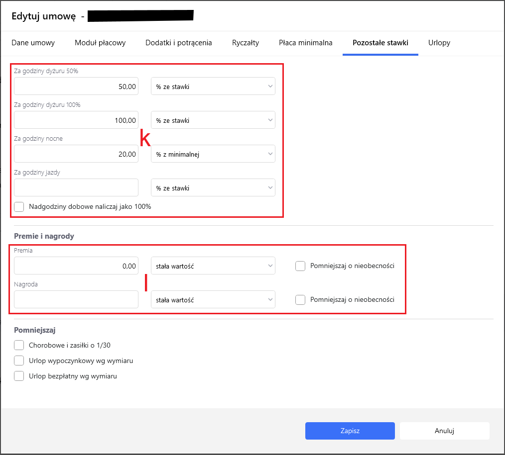 Kolejny widok “pozostałe stawki” zawiera informacje o sposobie wynagrodzenia pracownika, za wybrany składnik(k). Nie jest to miejsce na wprowadzenie stawki godzinowej. Służą one do tego abyś mógł/mogła za godzinę dyżuru 50% zapłacić stałą kwotę (np. 25 zł), procent z zaszeregowania (np. 75%), lub procent z minimalnej (np. 100%) czyli inny niż przewidują przepisy. W większości przypadków pola te nie są zmieniane.