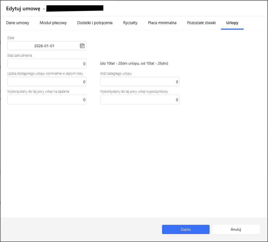 - Staż zatrudnienia – wpisz ilość lat stażu aby system automatycznie pilnował wysokości przysługującego urlopu (do 10 lat przysługuje 20 dni, powyżej jest to już 26 dni)