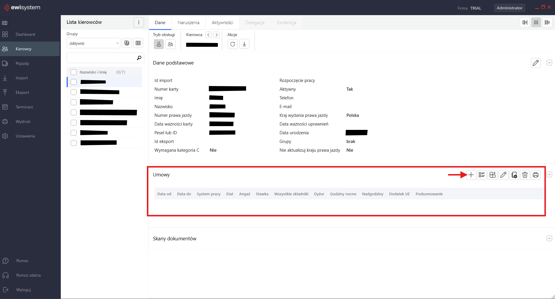 Kierowcę zatrudnisz dodając umowę ikoną plusa po prawej stronie ekranu w jego środkowej części.