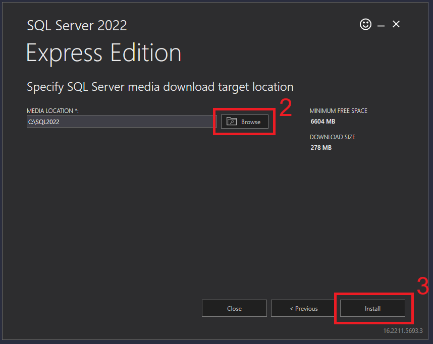 Po uruchomieniu pakietu kliknij „CUSTOM” (1) i w następnym oknie wybierz lokalizację plików instalacyjnych (2 – opcjonalne) a na koniec kliknij Install (3)