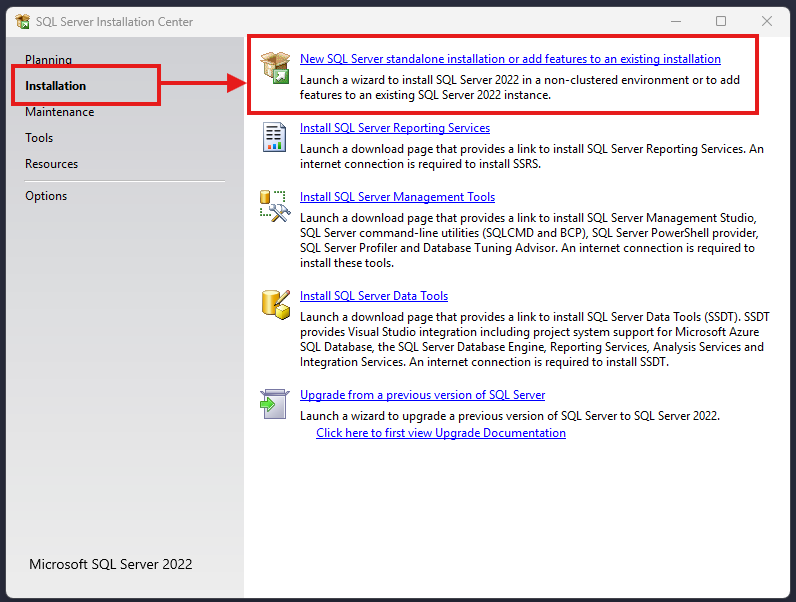 Po zakończeniu instalacji, pojawi się nowe okno „SQL Server Installation Center”. Przejdź do zakładki „Installation” i wybierz instalację nowego SQL.
