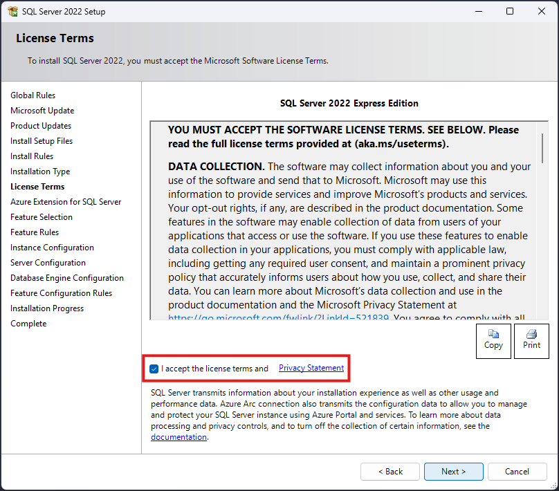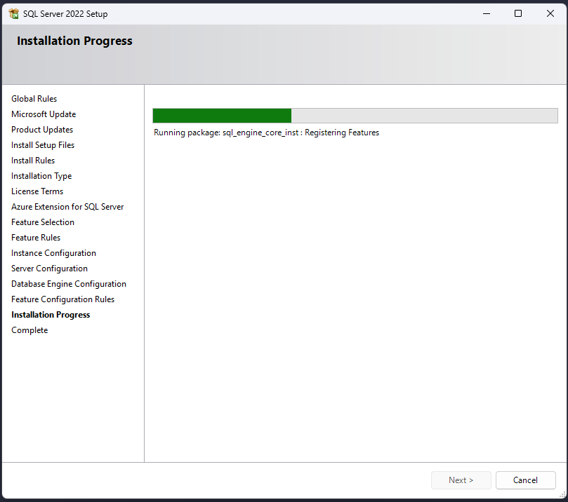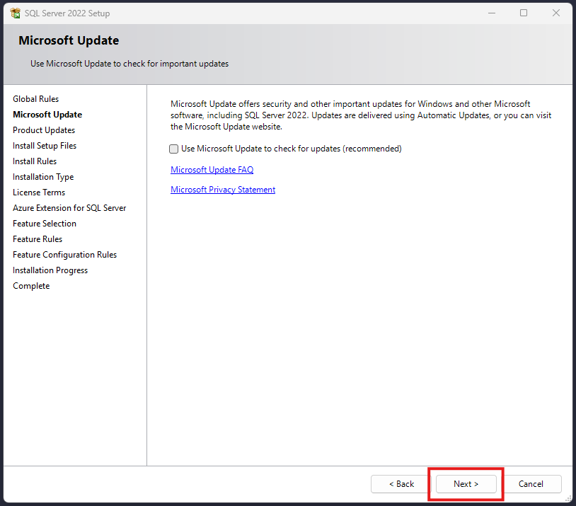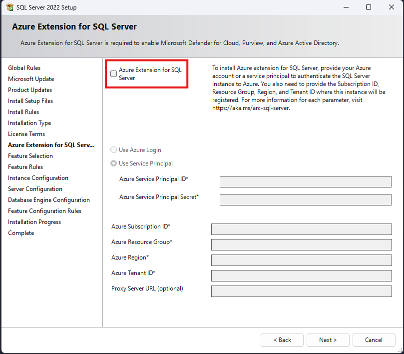 Kolejne okno to rozszerzenia Azure (w przypadku wersji SQL 2022). Nie jest ona wymagana do poprawnego funkcjonowania programu dlatego możemy odznaczyć rozszerzenie i przejść do następnego okna.