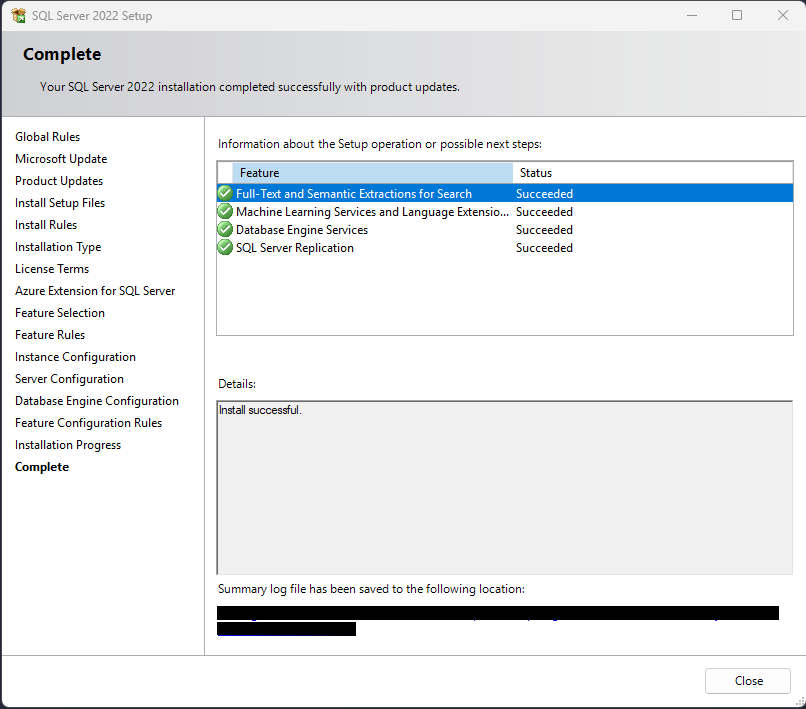 Zamknij instalację przyciskiem close i przejdź do nadania uprawnień użytkownikowi, w programie SQL Server Management Studio.