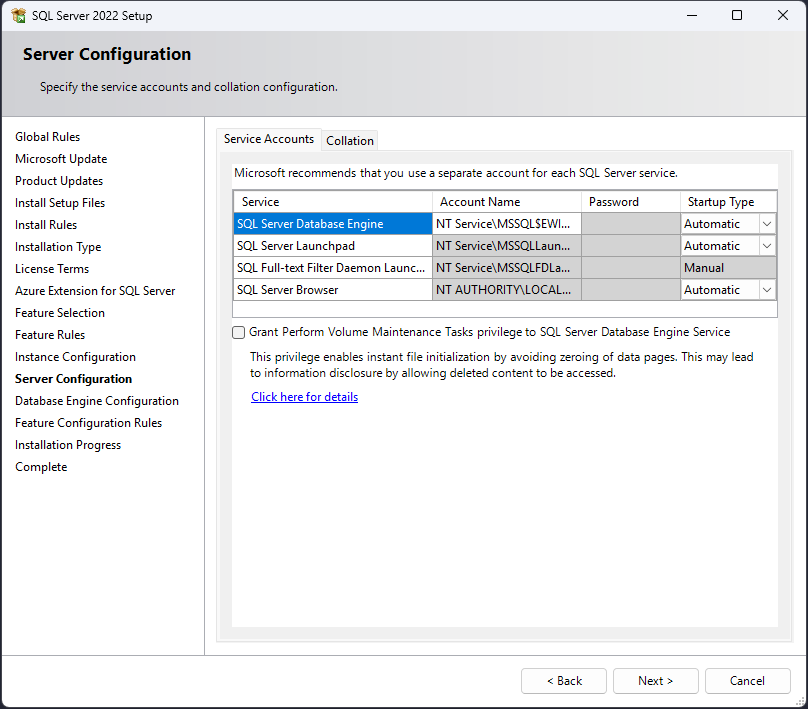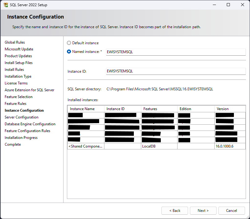 W tym kroku zmieniamy nazwę instancji – aby uprościć konfigurację, dobrą praktyką jest wpisanie „EWISYSTEMSQL” jako nazwę – dzięki temu w plikach konfiguracyjnych nie będzie potrzeby większej zmiany.
