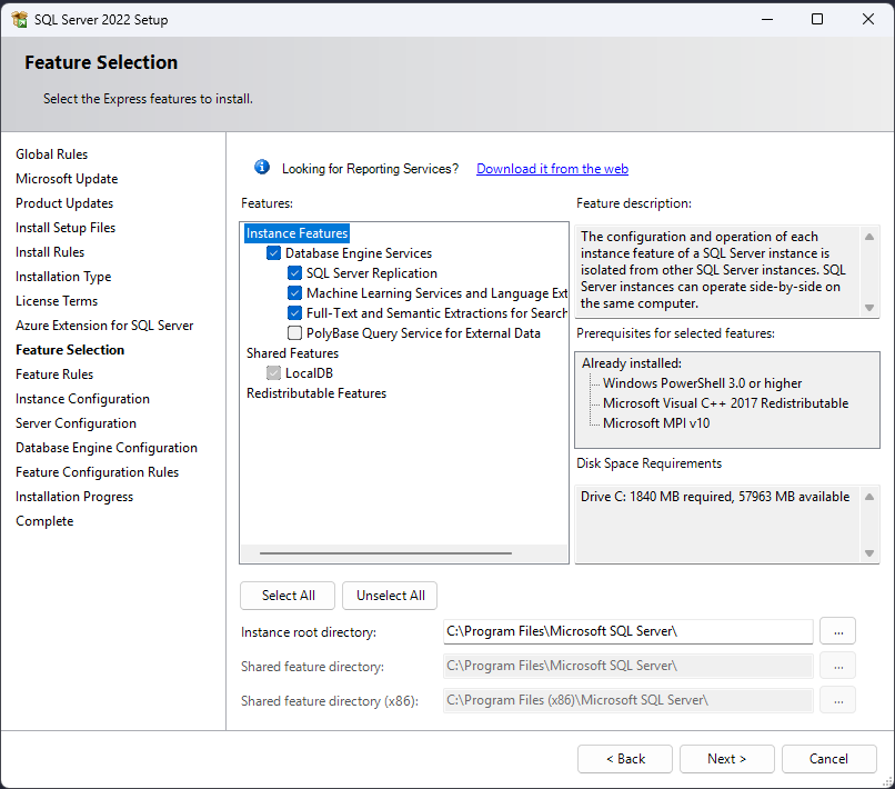 W tym miejscu wybieramy funkcje instancji. Po odpowiednim zaznaczeniu (wybrane powinny być opcje SQL server replication, machine learning services[…], full-text and semantic […] – patrz obrazek), możemy zmienić lokalizacje przechowywania plików (domyślnie dysk C). Po skończonej konfiguracji przechodzimy do następnego okna.