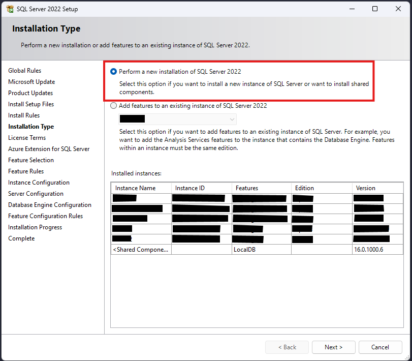 b) tworzenie instancji – kolejny krok to stworzenie nowej instancji w której będziemy przechowywać bazy danych. W oknie Installation Type wybieramy „Perform a new installation of SQL […]” i klikamy „Next”