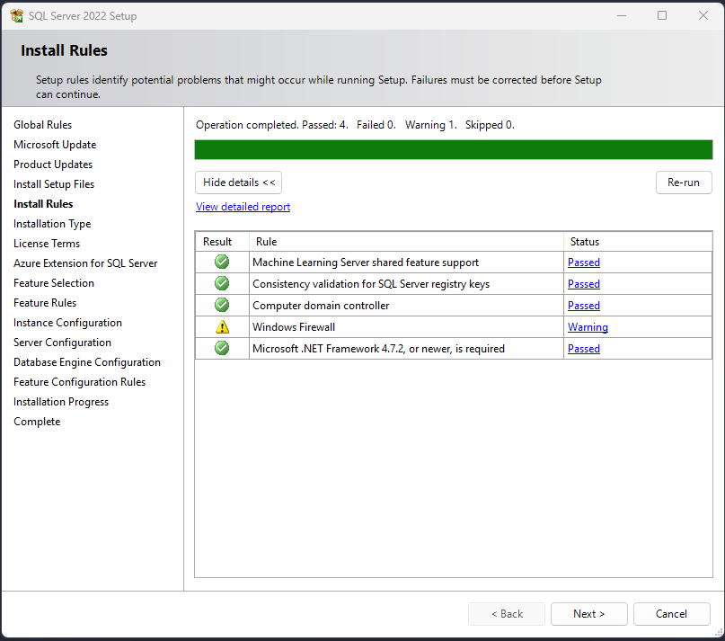 a po jego zakończeniu wyświetli się podsumowanie. Jeśli większość punktów ma status „Passed” – oznacza, że na komputerze można instalować bazy SQL.