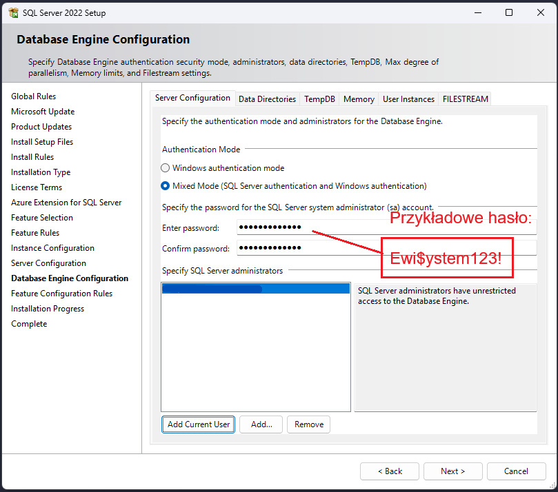 Teraz dodamy hasło logowania się do bazy danych. W przykładzie (zalecane) wybraliśmy opcję „Mixed mode” a w polu z hasłem wprowadź wsłasne lub przykładowe „Ewi$system123!”