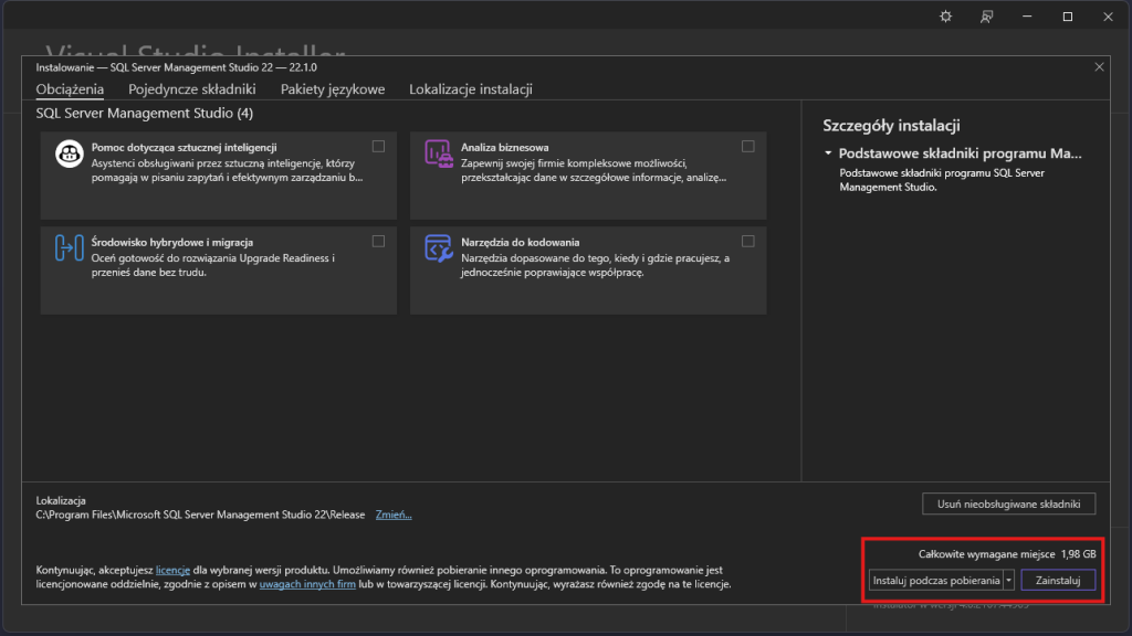 *Uwaga* Jeśli masz już zainstalowany program SQL Server Management Studio przejdź do kroku z połączeniem do bazy danych.