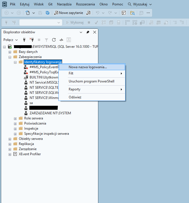 Po pomyślnym połączeniu z listy wybierz Zabezpieczenia>Inedtyfikatory logowania. Klikając prawym przyciskiem myszy na „Identyfikatory logowania” z wyświetlonych opcji kliknij „Nowa nazwa logowania”
