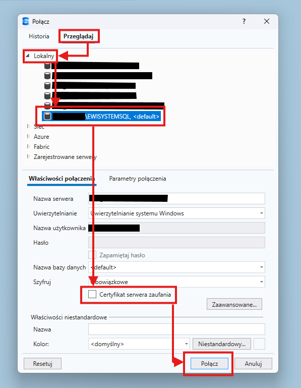 Po uruchomieniu zobaczysz okno z właściwościami połączenia z bazą danych. Wybierz zakładkę przeglądaj, następnie rozszerz serwery „lokalne” i wybierz zainstalowany (domyślnie EwisystemSQL). Poniżej zaznacz opcję „certyfikat serwera zaufania” i kliknij połącz.