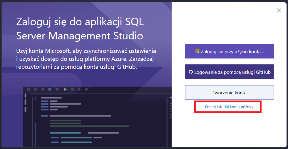Po uruchomieniu może pojawić Ci się informacja o logowaniu do aplikacji przy użyciu kont microsoftu lub GitHub’a, który możesz pominąć.