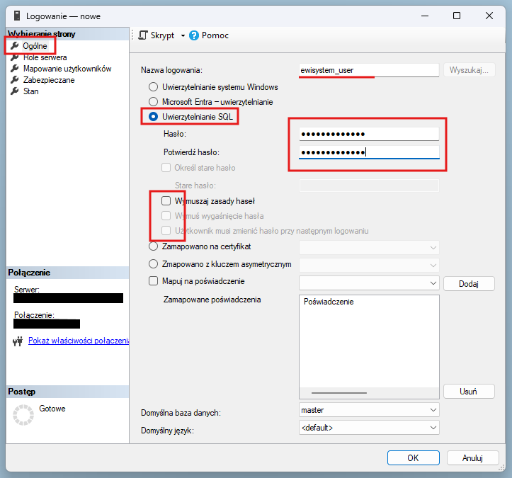 W tym oknie (zakładce ogólne) wprowadź nazwę użytkownika (ewisystem_user), zaznacz „Uwierzytelnianie SQL” a następnie w polu „Hasło” wprowadź* „Ewi$ystem123!” i wpisz to samo w polu potwierdzenia.