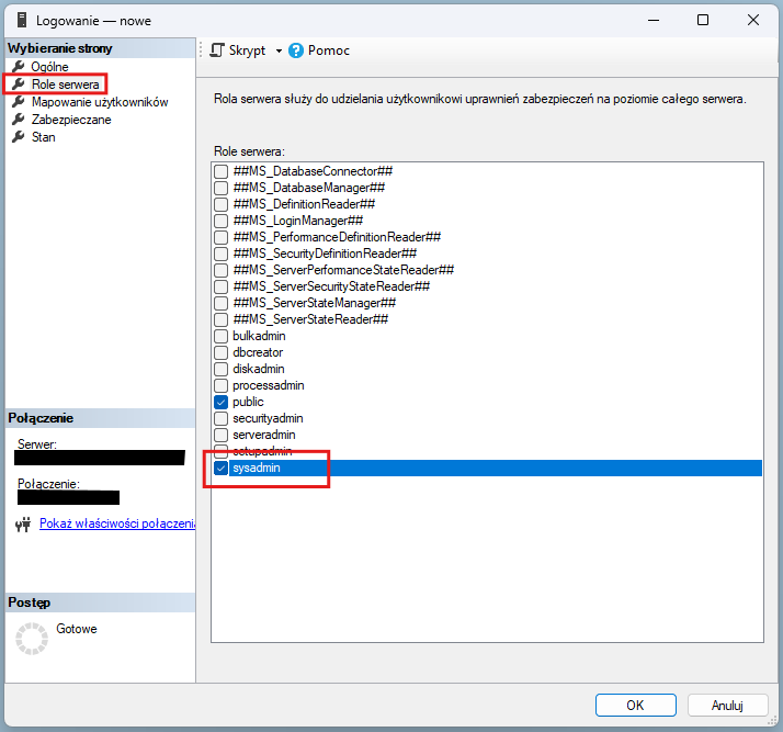 Ostatnim krokiem jest przejście do zakładki z rolami serwera i zaznaczenia roli „sysadmin”. Po tej operacji, zatwierdź zmiany wybierając „OK”. Teraz możesz uruchomić EwiSystem bez komunikatu błędu połączenia 😊
