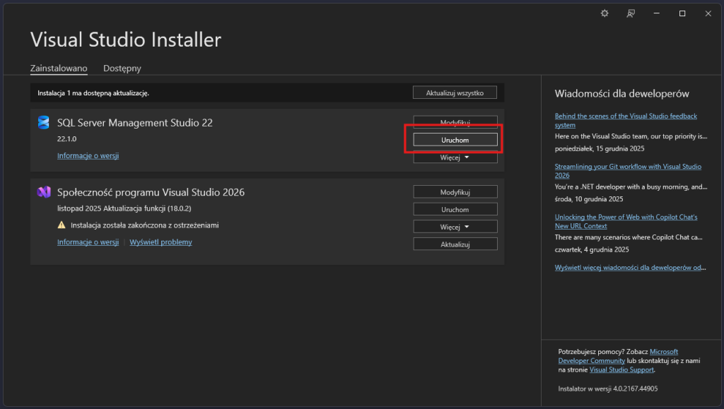 Po jego zakończeniu zobaczysz na liście niebieską ikonę SQL server managment studio a przy poprawnej instalacji pojawi się również przycisk „Uruchom”.