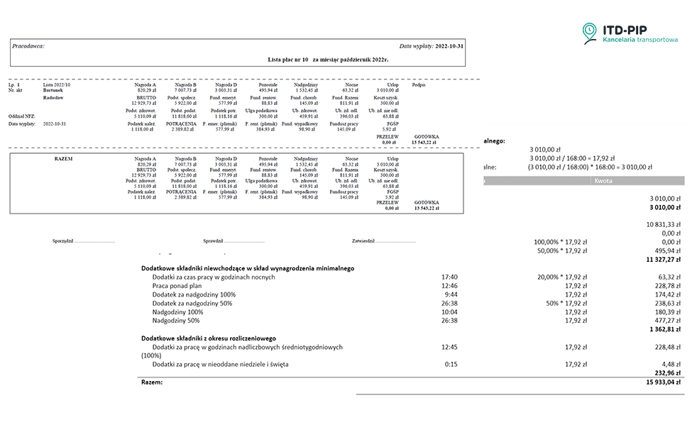 Dodatki z Pakietu Mobilności sumują się do całości wypłaty, a wartość diet wirtualnych (60/20 eur) obniża tę sumę do wartości nie mniejszej niż przeciętnego wynagrodzenia (6935 zł dla ZUS).